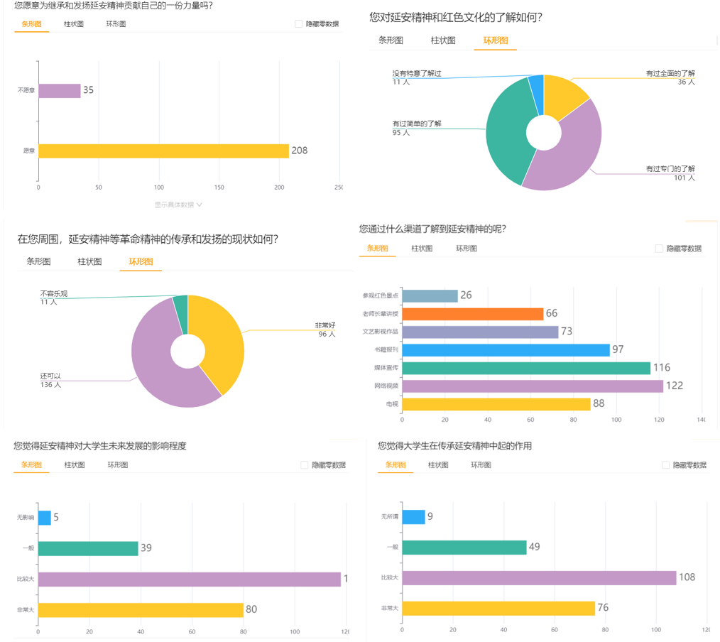 实践团通过线上线下向游客发出调查问卷260份,收回243份。通过统计分析,发现大部分人认为延安精神对当代老员工有一定影响,大家愿意继承和发扬延安精神,并且延安精神的宣传也需要老员工的加入。延安精神的继承与发扬需要不断开拓新模式、通过新途径、尝试新方法。