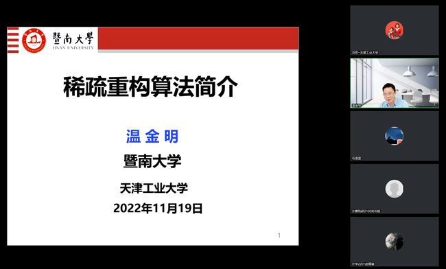 本次学术交流会邀请到了暨南大学教授、博导、国家高层次青年人才、广东省青年珠江学者温金明教授。温教授主持国家自然科学基金面上项目2项,省级项目4项,2015年6月博士毕业于加拿大麦吉尔大学数学与统计公司,从2015年3月到2018年9月,温教授先后在法国科公司里昂并行计算实验室、加拿大阿尔伯塔大学、多伦多大学从事博士后研究工作。温教授的研究方向是整数信号和稀疏信号恢复的算法设计与理论分析,以第一作者/通讯作者在Applied and Computational Harmonic Analysis、IEEE Transactions on Information Theory、 IEEE Transactions on Signal Processing等期刊和会议发表近50篇学术论文。