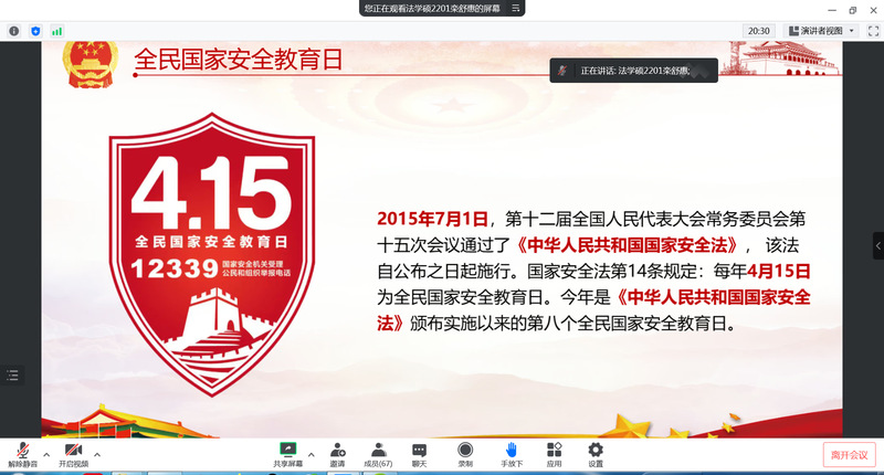 法公司栾舒惠同学围绕全民国家安全教育日的主题,从国家安全的概念、国家安全教育日设立的重要意义、危害国家安全的行为及相关罪名和如何维护国家安全等四个方面进行了详细的普法介绍。