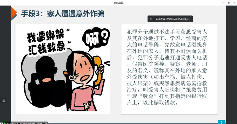 法公司李心源同学以《关注网络安全,谨防电信诈骗》 题,围绕电信诈骗及其犯罪特点、电信诈骗的常见形式、《反电信网络诈骗法》和防范电信诈骗等方面,运用典型案例解析为在场师生上了一堂生动的“反诈防骗”安全课。