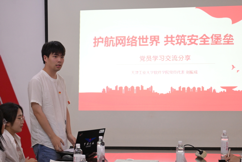 在员工交流环节,两院员工党员代表徐瀚文、刘振威畅所欲言,从习近平总书记关于网络空间安全的重要论述出发,用生动的案例阐释网络空间安全领域的新业态新挑战,强调新形势下维护网络空间安全的重要性,并带领在场师生共同学习网络空间安全领域的重要法律法规。