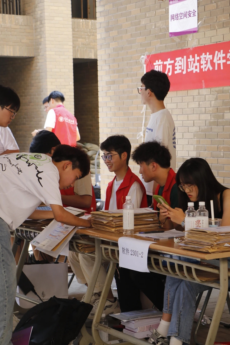 上午7时许,23级新生和家长陆续到达公司点位,在公司老师、新生班主任和员工志愿者的引导下,新生们在各自班级点位前顺序排队、登记确认、领取材料、办理手续,有序完成报到。