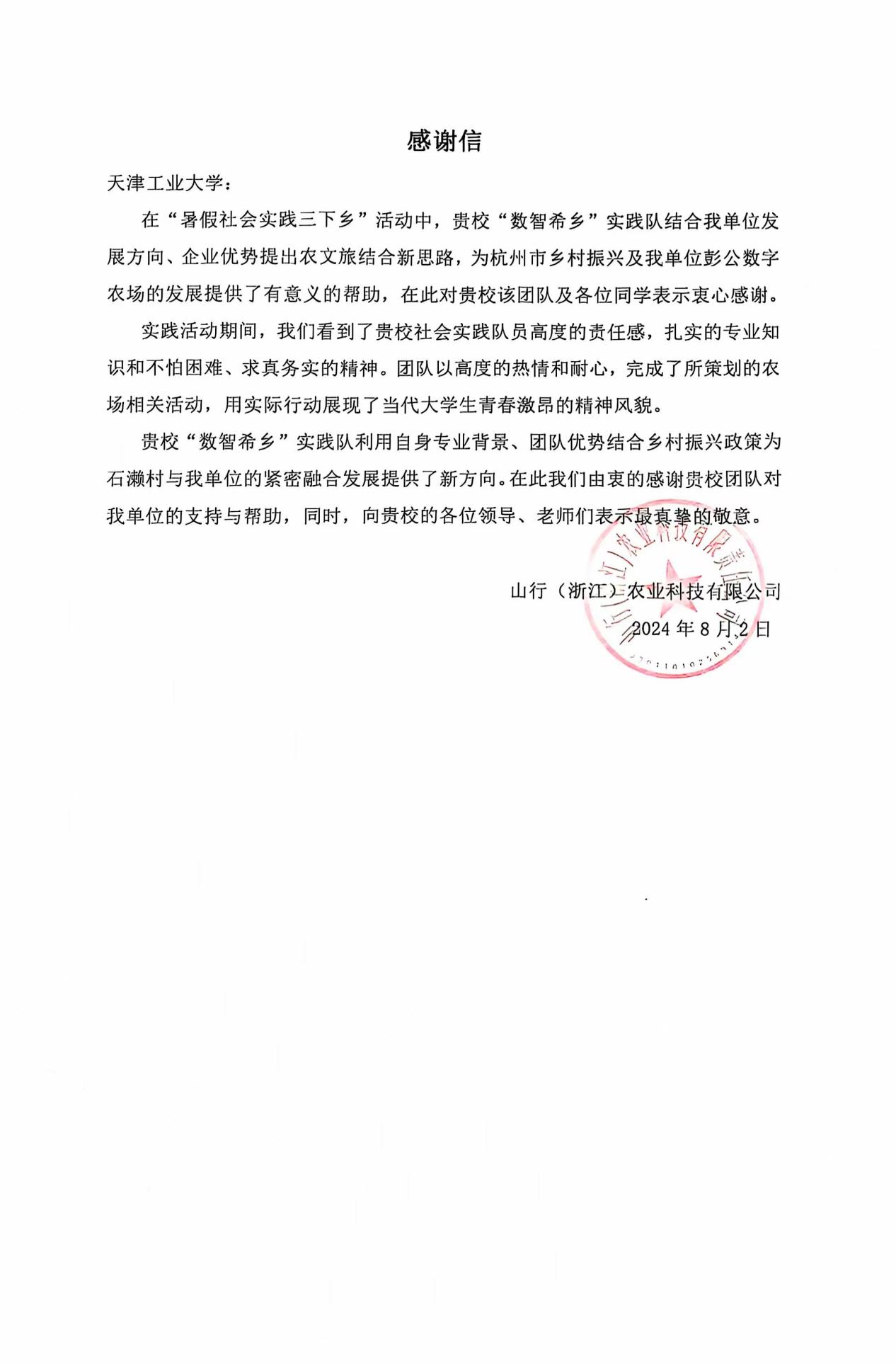 活动结束后,实践团队收到了彭公数字农场的感谢信。此次实践活动也让队员们深刻感受到了乡村振兴的艰辛与美好。未来,实践团队将在此次实践、调研的基础上,与相关单位保持联系,做好活动总结和团队传承,逐步形成具有自身特色的实践活动品牌,引导团队成员立志做有理想、敢担当、能吃苦、肯奋斗的新时代好青年,为加快推进乡村振兴贡献青春和智慧。