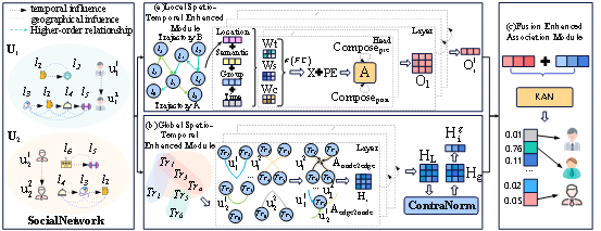 论文提出了一种分层时空增强注意力超图网络StarNet,用于识别和链接跨领域数据集的用户轨迹。该模型由局部时空增强模块、全局时空增强模块和融合增强关联模块三部分组成。局部时空增强图神经网络模块将图卷积网络与动态可组合的多头注意力机制相结合,以自适应地调整多维数据特征。为了捕捉跨领域轨迹之间的高阶关系并缓解轨迹稀疏性,全局时空增强超图网络模块将交叉注意力和对比归一化层集成到时空超图网络中。最后,融合增强的关联模块利用KANs来自适应地合并局部和全局轨迹表示,从而实现精确的用户身份链接。在两个真实世界的LBSN跨域数据集上的广泛比较实验表明,StarNet在所有评估指标上都显著优于多个最先进的基线模型。