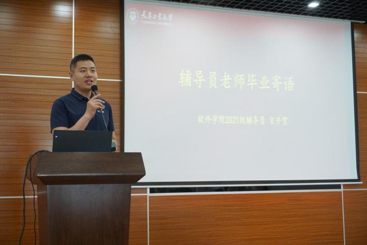 在这之后,毕业年级辅导员宋开贺老师为毕业生党员送上了青春寄语。他深情回顾了与2021级同学们相处的点点滴滴,肯定了大家在大学期间取得的进步与成绩,同时也对大家未来的发展提出了殷切期望。希望毕业生党员们在今后的工作和生活中,能够继续保持积极向上的心态,不断学习、努力进取,在面对困难时保持坚韧不拔的毅力,在纷繁复杂的社会环境中坚守初心和使命,始终发挥党员的先锋模范作用,为母校争光、为党旗添彩。