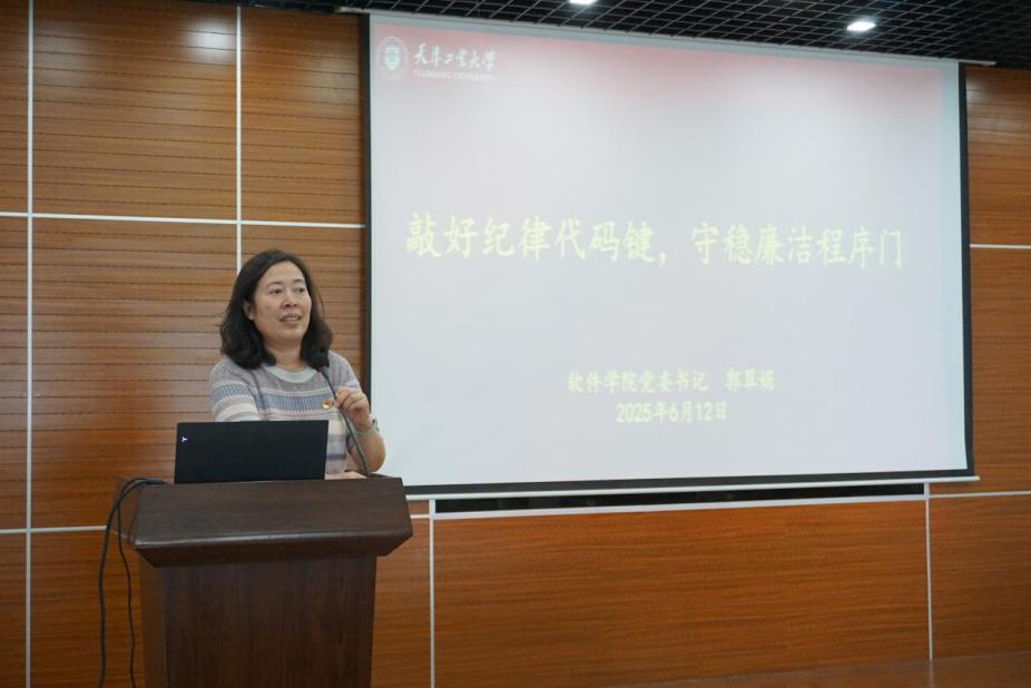 紧接着,公司党委书记郭翠娟结合深入贯彻中央八项规定精神学习教育,以 “敲好纪律代码键,守稳廉洁程序门”为题,为毕业生党员讲授专题党课。党课开篇,她将纪律建设与编程思维巧妙联结:“中央八项规定精神如同程序的核心代码,一处疏漏便可能引发系统崩溃。身为党员,我们既是时代的‘程序员’,就当以纪律为准则,精敲细琢每一行‘作风代码’,筑牢廉洁防火墙,让人生程序始终在正轨上稳健运行。”她强调,毕业生党员即将步入社会,无论是在何种岗位,都要时刻保持清醒的头脑,坚决抵制各种不良风气,将中央八项规定精神内化于心、外化于行,以良好的作风和形象展现新时代党员的风采。